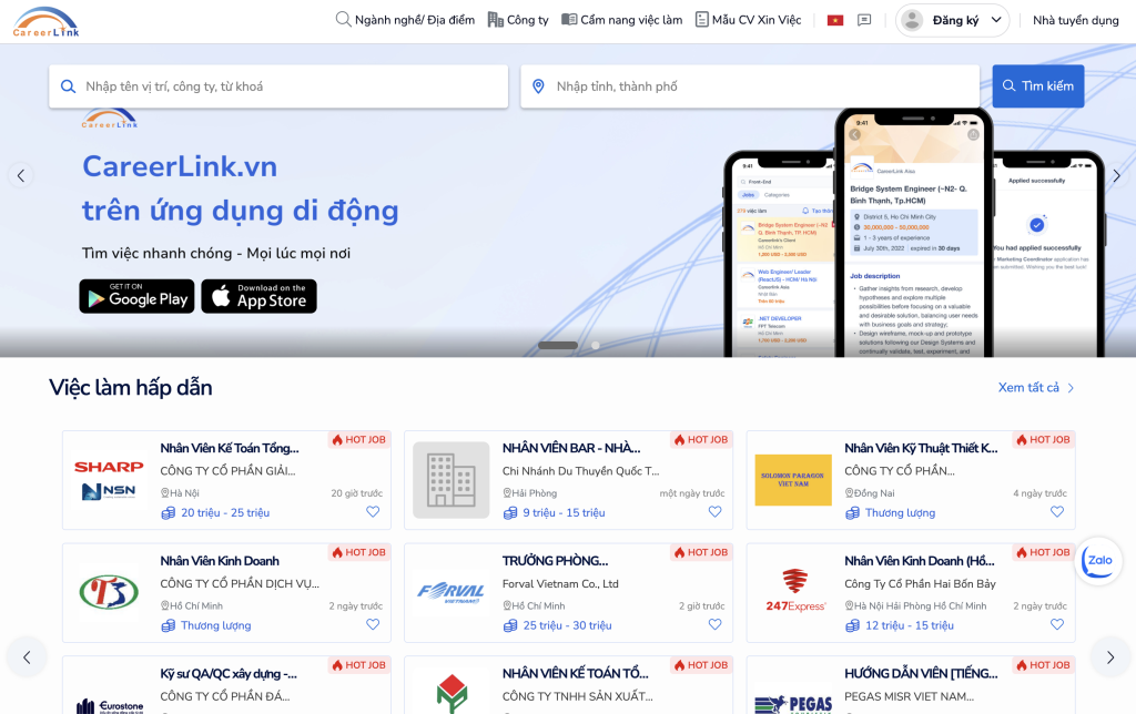 Nếu bạn đang tìm kiếm những cơ hội nghề nghiệp tốt nhất cho người biết tiếng Trung, Careerlink chính là địa chỉ tin cậy hàng đầu. Với hệ thống đối tác là các tập đoàn đa quốc gia và doanh nghiệp lớn, trang web cung cấp hàng ngàn vị trí tuyển dụng được cập nhật mỗi ngày. Tại đây, bạn có thể dễ dàng lọc công việc theo mức lương, địa điểm và cấp bậc mong muốn, giúp lộ trình sự nghiệp trở nên rõ ràng và thuận lợi hơn.